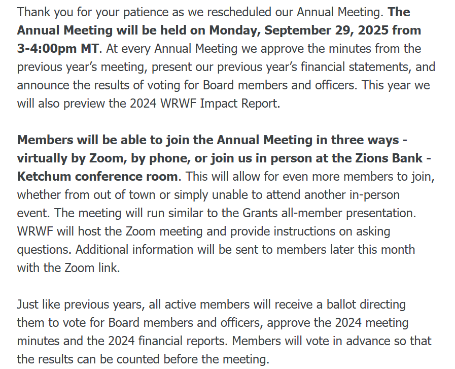 Annual WRWF member meeting to elect Board members and Officers, approve 2024 financial statements, and approve 2024 Annual Meeting Minutes.